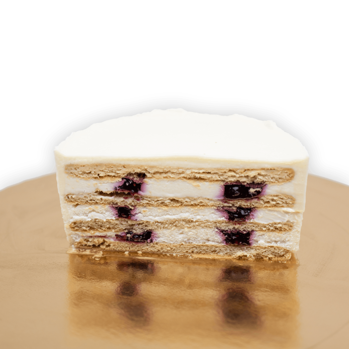 1. Тонкие сливочные коржи с сырным кремом, вкраплениями ягодной начинки из черной смородины и малины или. Покрытие - крем чиз.