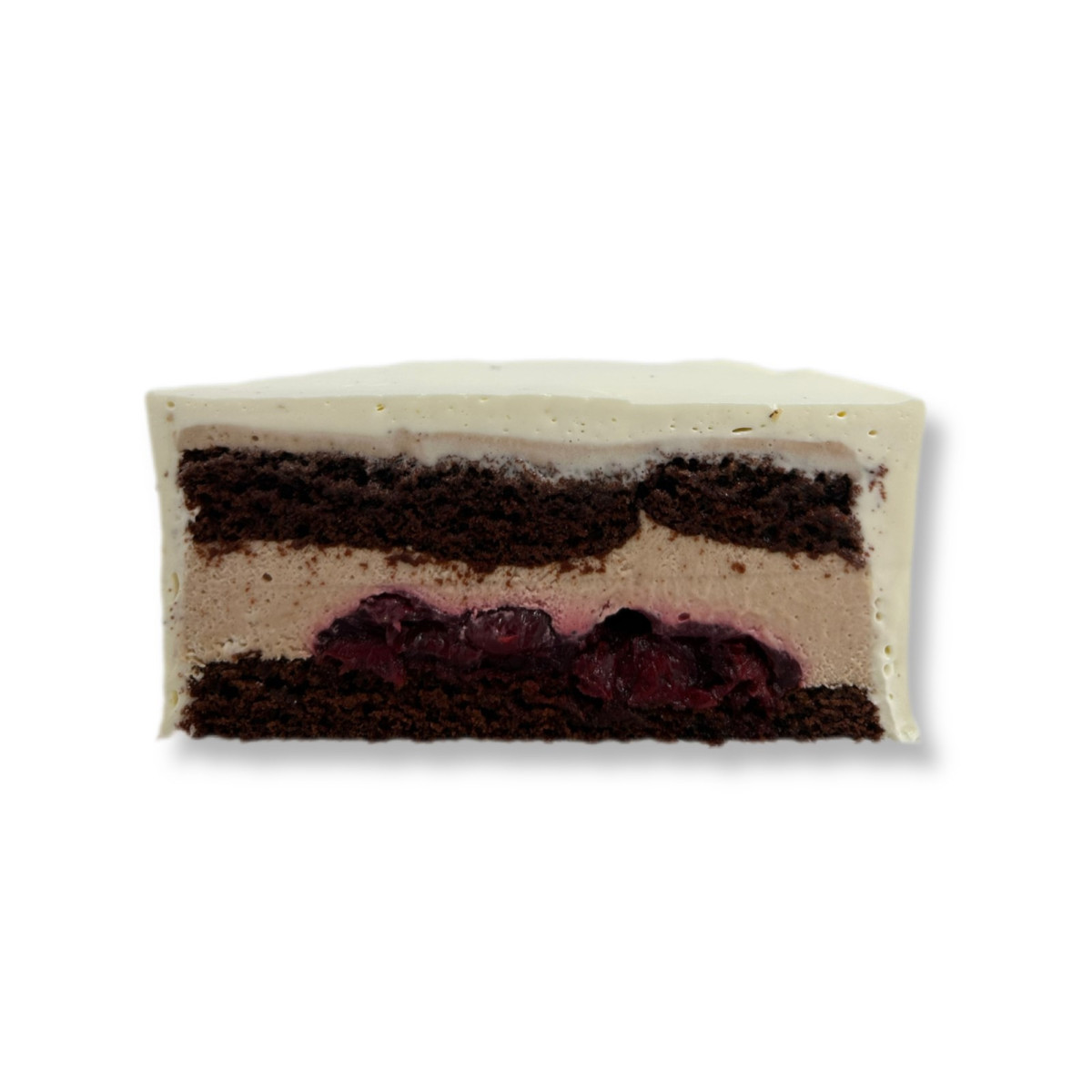 2. Воздушный шоколадный бисквит с шоколадно-сливочным кремом и вишневым конфи (с цельными ягодками вишни). Покрытие крем-чиз.