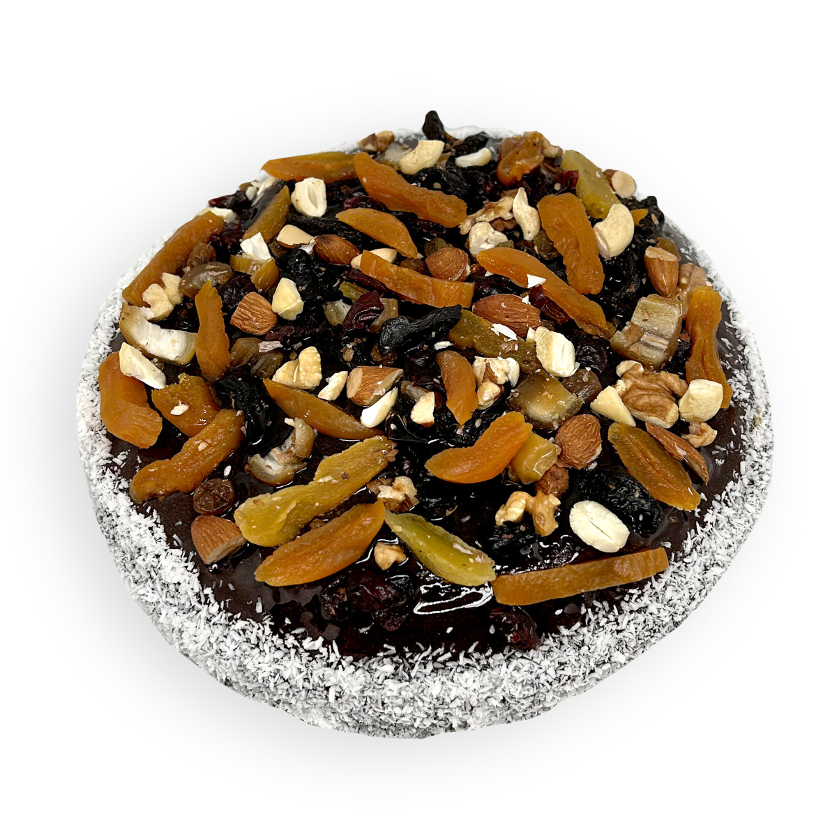 Влажный шоколадный бисквит с абрикосовым джемом, сухофруктами и орехами.