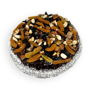 Состав:вода, мука пшеничная, какао, масло растительное, сахар,ванилин, соль, разрыхлитель, джем абрикосовый, пектин Nh, финики, грецкий орех, миндаль, изюм, курага, клюква вяленая, кешью, кокосовая стружка, глюкозный сироп, агар, кислота лимонная.