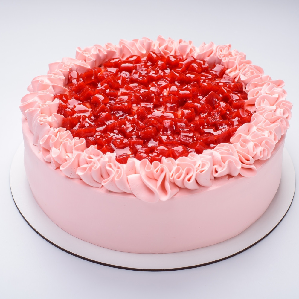 Бисквит с клубничным пюре, клубничная намелака, банановый крем с банановым муссом, клубничный мармелад.